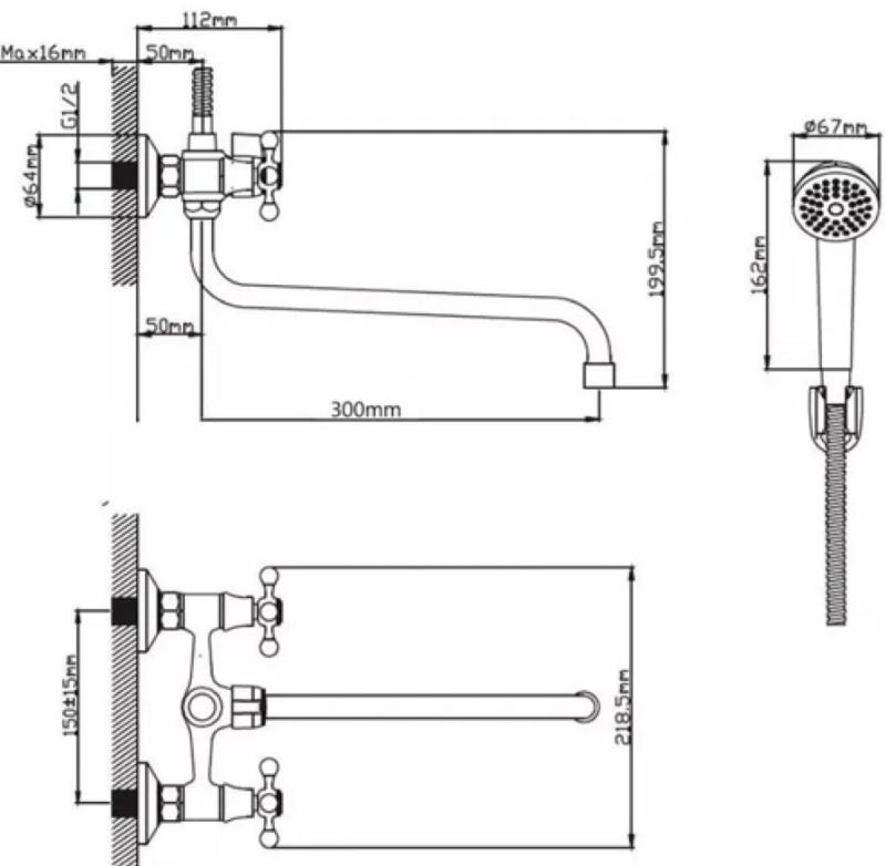 Смеситель для ванны Diadonna D226-65 с длинным изливом, настенный, с лейкой, хром. Все характеристики |