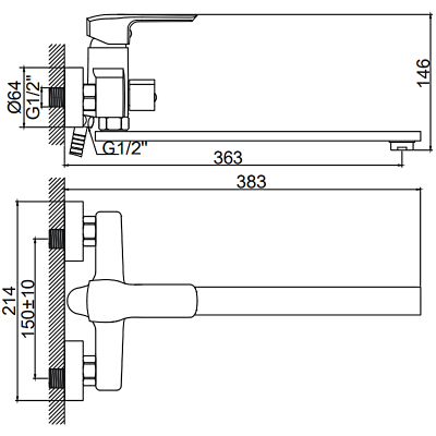 Смеситель для ванны Ledeme H58 L2258 с длинным изливом, с душем, настенный. Все характеристики |