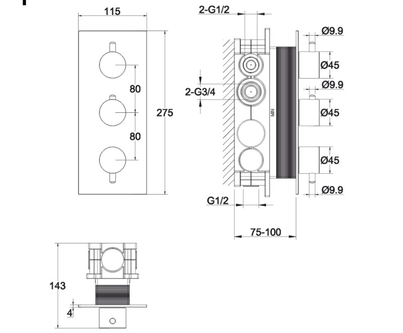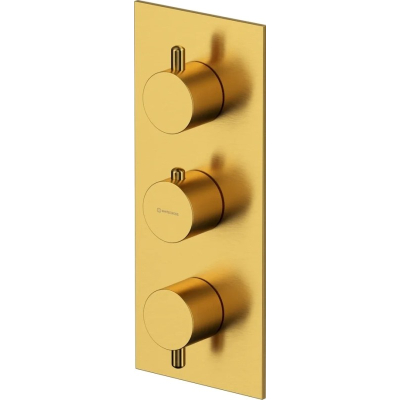 Скрытый монтаж. Размеры розетки 11.5х27.5 см. Минимальная глубина для установки 7.5 см. PVD покрытие, цвет-брашированное золото. Гладкая и матовая поверхность. Термостатический картридж с ограничителем на 38°C Vernet. Два входа (для горячей и холодной воды) - 3/4”. Два выхода смешанной воды - 1/2”. Запорно-переключающий вентиль. Пропускная способность при давлении 3 Бар для каждого из трех потоков 21 л/мин. Встраиваемый смеситель-термостат для ванны и душа Y Y1238GLB на стену.