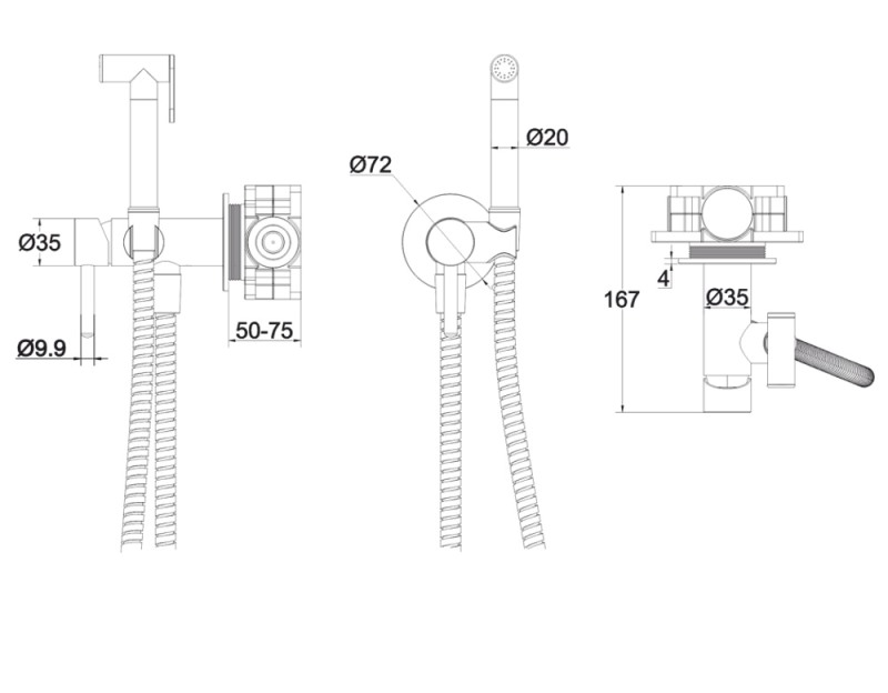 В комплекте: наружная часть смесителя с держателем для душа, встраиваемый механизм, гигиеническая лейка, душевой шланг.