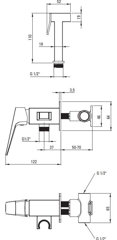 В комплекте: смеситель, гигиенический душ, душевой шланг, держатель гигиенического душа с подключением. |