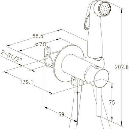 В комплекте: смеситель для душа встроенный с держателем лейки, гигиенический душ D=2.8 см 1 режим ABS-пластик, душевой шланг 120 см ПВХ. |