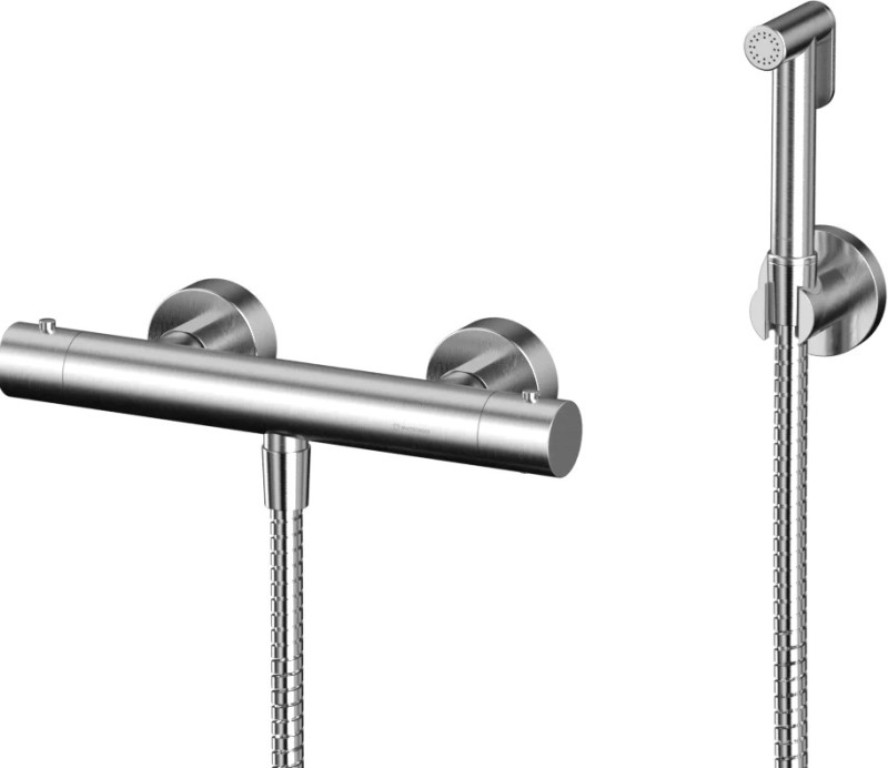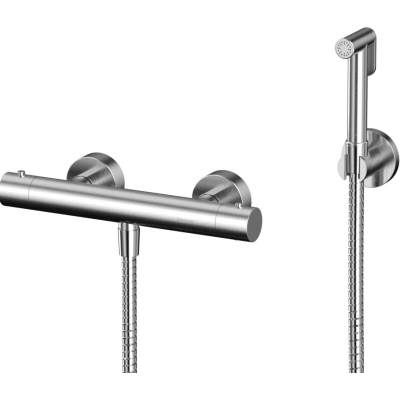 В комплекте: смеситель-термостат, держатель для душа, гигиеническая лейка, душевой шланг.