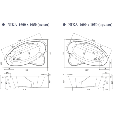 Угловая ванна Vento Nika 160x105 R, правая. Все характеристики |