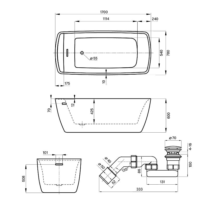 Акриловая ванна Wellsee Ideal 170x78, отдельностоящая, белый глянцевый/черный. Все характеристики |