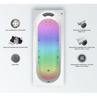 В комплекте: металлический каркас с монтажным набором 35500020, подголовник AH17, набор для гидромассажа и хромотерапии на электроуправлении со стоп-функцией 19P1NA: электронный пульт, микропроцессор, таймер, пульсирующий режим, мидифорсунки по бокам ванны-6 шт., минифорсунки для массажа спины-4 шт., минифорсунки для массажа стоп-2 шт., помпа HydroAir 800 Вт, датчик уровня для защиты от сухого пуска.Дополнительно комплектуется: утраплоский фронтальный экран 35500030, ультраплоский боковой экран 35500040, смеситель, сифон. Внимание! Комплектация гидромассажа на фотографии ванны представлена для ознакомления. Виды гидромассажных систем, количество форсунок и их расположение возможны в нескольких вариантах. Для уточнения деталей по итоговому комплекту гидромассажной ванны просьба обращаться за консультацией к нашим менеджерам. |