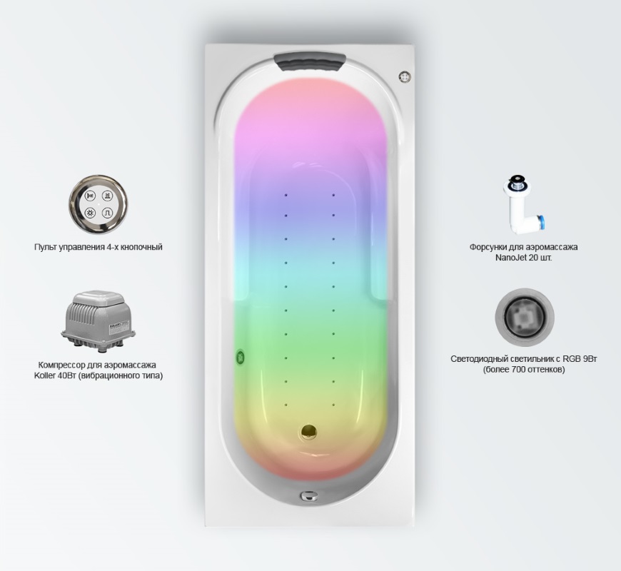 В комплекте: металлический каркас с монтажным набором 35500021, подголовник AH17, комплект для аэромассажа и хромотерапии на электроуправлении со стоп-функцией 19P3NA: электронный пульт, микропроцессор, таймер, нанофорсунки-20 шт., компрессор Koller 40 Вт., автоматическая сушка, датчик уровня воды для защиты от сухого пуска.Дополнительно комплектуется: утраплоский фронтальный экран 35500031, ультраплоский боковой экран 35500041, смеситель, сифон. Внимание! Комплектация гидромассажа на фотографии ванны представлена для ознакомления. Виды гидромассажных систем, количество форсунок и их расположение возможны в нескольких вариантах. Для уточнения деталей по итоговому комплекту гидромассажной ванны просьба обращаться за консультацией к нашим менеджерам. |