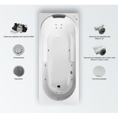 В комплекте: металлический каркас с монтажным набором 35500021, подголовник AH17, набор для гидромассажа 19H2NA: мидифорсунки по бокам ванны-6 шт., минифорсунки для массажа спины-4 шт., минифорсунки для массажа стоп-2 шт., помпа HydroAir 800 Вт, датчик уровня для защиты от сухого пуска, пневмоуправление с регулятором аэрации.Дополнительно комплектуется: утраплоский фронтальный экран 35500031, ультраплоский боковой экран 35500041, смеситель, сифон. Внимание! Комплектация гидромассажа на фотографии ванны представлена для ознакомления. Виды гидромассажных систем, количество форсунок и их расположение возможны в нескольких вариантах. Для уточнения деталей по итоговому комплекту гидромассажной ванны просьба обращаться за консультацией к нашим менеджерам. |