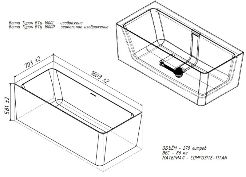 Ванна из искусственного камня Belux Турин ТУ-1600 L 160x70 левая, белый матовый 18. Все характеристики |