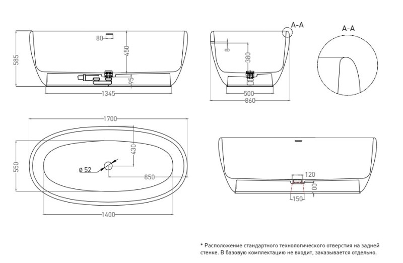 Ванна из искусственного камня Salini Luce 170x85 отдельностоящая, S-Stone белый матовый. Все характеристики |